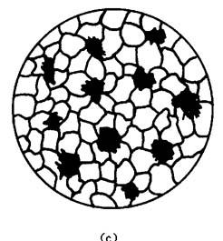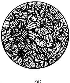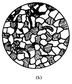 | 释义 | 铸铁 4.3.1.1 铸铁的特点和种类 铸铁是碳的质量分数大于2.06%的铁碳合金.工业上常用的铸铁一般碳的质量分数在2.5%~4.0%的范围内,此外,还含有硅、锰、硫、磷等元素. 铸铁具有许多优良的性能,如良好的铸造性、减磨性、切削性及低的缺口敏感性等,而且生产简便,价格低廉.因此它是铸造生产中最重要的铸造合金. 铸铁根据其中碳的存在形态可分为以下几类: (1)白口铸铁.在白口铸铁中的碳除少量溶入铁素体中外,其余的都以化合状态(Fe3C)存在,因其断口呈银白色,故称之为白口铸铁,如图4-4(a)所示.由于白口铸铁中存在大量硬而脆的Fe3C,故白口铸铁的性能非常硬和脆,不能切削加工.因此,工业上很少直接用它来制造机器零件,而主要用作炼钢的原料,或用于制造可锻铸铁的毛坯.但有些零件,如冷硬轧辊、犁铧等,为了得到较高的表面硬度和耐磨性,常采用激冷的方法使零件表面层获得白口铸铁组织,而心部则是灰口铸铁组织,这种铸铁称为“激冷铸铁”. (2)灰口铸铁(简称为灰铸铁).灰口铸铁中碳大部或全部以片状石墨形式存在,其断口呈灰色,故称之为灰口铸铁,如图4-4(b)所示.它有一定的力学性能和良好的工艺性能,是工业生产中使用最多的一种铸铁. (3)可锻铸铁.可锻铸铁是由白口铸铁经长时间的高温退火而制成的.其中的碳大部或全部以絮状石墨的形式存在,如图4-4(c)所示. (4)球墨铸件.球墨铸铁中碳大部或全部以球状石墨的形式存在,如图4-4(d)所示.