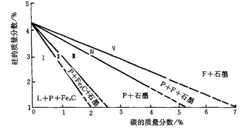 图4-4 碳在铸铁中存在的形态 (a)白口铸铁;(b)灰口铸铁;(c)可锻铸铁;(d)球墨铸铁 4.3.1.2 影响铸铁石墨化的因素 铸铁中的碳,可能以化合状态(Fe3C)或自由状态(石墨)两种形态存在.在生产中常会发现C、Si、Mn含量低,S含量高的铸铁容易造成白口的铸件;或者,在同一个铸件中往往在表层或薄壁部分容易出现白口,而厚壁铸件或铸件心部容易获得灰口组织.这表明铸铁的化学成分和铸件的冷却速度与铸铁的石墨化有着密切的关系. 1.化学成分的影响 碳和硅是铸铁中最基本的两个合金元素,对铸铁的组织和性能起着决定性的影响.碳和硅促进铸铁石墨化,而硅的作用比碳的作用更大.铸铁中碳和硅含量越高,越易获得灰口组织.在一定冷却速度条件下,碳和硅的含量与铸铁所获得的组织有如图4-5所示的关系.其中Ⅰ区属白口铸铁区,Ⅲ、Ⅳ、V区属灰口铸铁区,Ⅱ区称麻口铸铁区(具有白口与灰口的混合组织),断面呈灰白相间麻点状,性能硬脆,很少应用.因此,为了得到灰口铸铁,它的碳、硅含量应比较高,一般碳的质量分数为2.8%~4.0%,硅的质量分数为1%~3%.