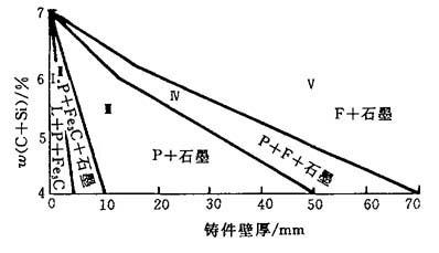 图4-5 碳、硅含量对铸件组织的影响(壁厚为50mm) 硫以硫化铁(FeS)形式溶解于铁水中,结晶时硫化铁和铁生成低熔点(985℃)共晶体,位于晶界上阻碍碳原子的扩散,强烈促进铸铁的白口化,所以硫的质量分数应控制得尽可能低些,一般在0.1%以下. 锰也是阻碍石墨化的元素,但它和硫有很大的亲和力.它可与硫结合生成硫化锰(MnS),并浮集到熔渣中,所以它可以抵消各自单独存在时所表现的阻碍石墨化作用.为了消除硫的影响,所需的锰量约为硫量的1.7倍,通常取ω(Mn)=1.7ω(S)+0.3. 磷对石墨化稍起作用,它能使共晶点左移,降低碳的饱和浓度,有利于石墨析出. 综上所述,碳、硅和锰是调整组织元素,硫是限制元素,而磷是控制使用元素.其他合金元素对铸铁的石墨化也有不同的影响. 2.冷却速度的影响 冷却速度对铸铁石墨化的影响很大.冷却速度越慢,越有利于石墨化的进行.但冷却速度主要由铸件壁厚所决定,因此,为了保证能获得所需要的灰口铸铁组织,生产上常利用调整铸铁中的碳和硅的含量来达到目的.图4-6表示了铸铁的成分(C与Si的总含量)、冷却速度(以铸件壁厚表示)对石墨化(铸铁组织)的影响.铸铁的石墨化除了直接由液体金属结晶过程来实现外,还可以通过已形成的白口铸铁组织中的Fe3C的分解来实现.这是因为在铸铁中Fe3C是个比较不稳定的组织,在一定温度下可以分解为A+石墨(沿PSK温度线)或F+石墨(低于PSK线).