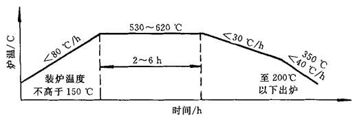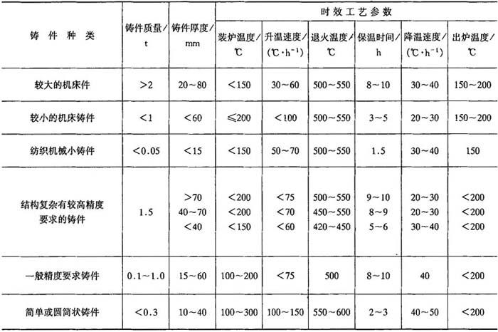 图4-7 典型时效热处理曲线 时效热处理温度越高,铸件残留应力消除越显着,铸件尺寸稳定性也越好.但随着时效温度的提高,时效后铸件的力学性能有所下降.铸件时效热处理的最高温度可按下式选择: T=480+0.4σb 式中 σb——直径30mm标准试棒的抗拉强度,MPa. 保温时间的影响要比时效温度的影响校一般按每小时热透铸件25mm厚计算. 加热速度一般取50~100℃/h,复杂铸件应控制在20℃/h以下.随炉冷却速度应控制在30℃/h以下,在200℃后再空冷. 表4-17是各类铸件的时效热处理规范.应该指出,严格控制铁液成分、浇注工艺、铸型工艺、落砂工艺(开箱时间及冷却条件),能减小铸造应力.对一般件(包括小汽车发动机缸体等)可不用时效热处理. 表4-17 各类铸件的时效热处理规范