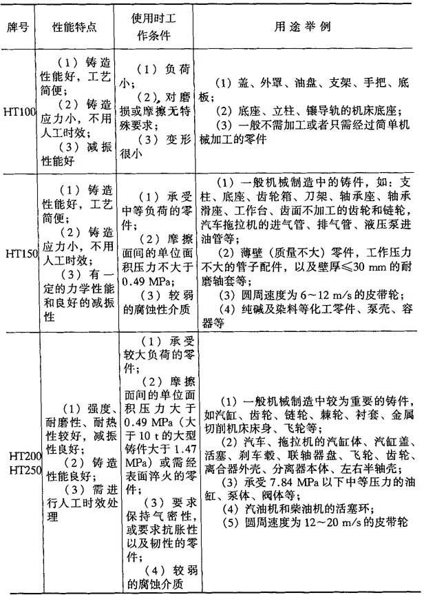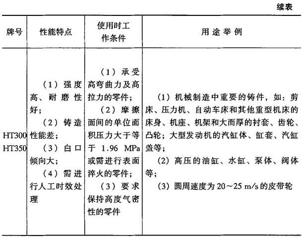 (2)石墨化退火.消除铸件上的自由渗碳体,降低硬度,改善力学性能和切削性能的退火称为石墨化退火.石墨化退火规范为:低于200℃装炉,以70~100℃/h的温度升温至900~960℃,保温1~4h(取决于壁厚),然后炉冷至临界温度下空冷.为了避免二次应力的产生,可以快速冷却到600℃,然后以50~100℃/h的速度冷却到300℃以下出炉空冷. (3)表面淬火热处理.用快速加热的方法,对铸件表面加热、冷却的热处理工艺叫表面淬火热处理.淬火后的表面能获得马氏体+石墨的组织,珠光体基体淬火后表面硬度可达HRC50左右.表面淬火热处理主要用于机床导轨、衬套、平板和齿轮等零件. 表面淬火热处理根据加热方式不同,可分为火焰表面淬火、感应加热淬火和电接触加热淬火. 4.灰口铸铁的性能特点及应用 灰口铸铁的性能特点及应用如表4-18所示. 表4-18 灰口铸铁的性能特点及应用