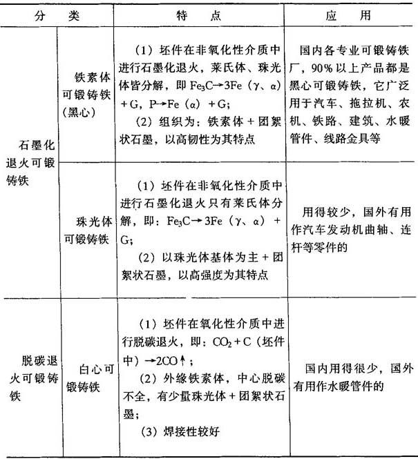 注:人工时效是将冷却后的铸件放在100~200℃的炉中,随炉升温至500~600℃,经较长时间保温后,缓慢地冷却下来. 4.3.1.4 可锻铸铁 可锻铸铁是由具有一定化学成分的铁液浇注成白口坯件,再通过石墨化或氧化脱碳可锻化处理而获得具有较高韧性的铸铁.可锻铸铁又称马铁、马钢.与灰铸铁相比,可锻铸铁有较好的强度和塑性,特别是低温冲击性能较好;耐磨性和减振性优于普通碳素钢;铸造性能不如灰铸铁;切削性能优于钢和球墨铸铁而与灰铸铁接近.可锻铸铁广泛应用于管类零件、汽车、拖拉机、农机具等大批量生产的薄壁中小件. 1.可锻铸铁的分类及特征 可锻铸铁的分类及特征见表4-19. 表4-19 可锻铸铁的分类及特征