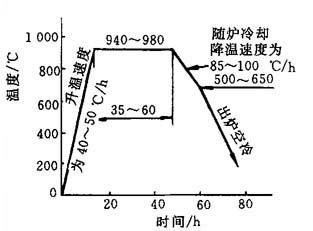 注:我国GB9440—88标准确认:经石墨化退火的铁素体基体的可锻铸铁为黑心可锻铸铁. 2.可锻铸铁的石墨化及一般热处理规范 可锻铸铁的主要生产工艺过程是对白口铁进行退火处理,使其碳化物(Fe3C)分解而产生团絮状石墨(称石墨化),从而获得所需的可锻铸铁组织. 白心可锻铸铁的氧化退火法如图4-8所示,将铸件放入填有矿石、氧化铁皮等氧化性物质的密封箱内,一般以40~50℃/h的加热速度加热至940~980℃,保温35~60h后再以85~100℃/h的冷却速度随炉降温.在长时间的高温作用下,使其产生第一次石墨化过程,即渗碳体(Fe3C)分解为奥氏体和团絮状石墨;以后冷却至共析温度(723℃)时,产生第二次石墨化过程,即奥氏体转变为珠光体.由此得到白心可锻铸铁的组织.在退火过程中,铸件中的部分碳被氧化掉.