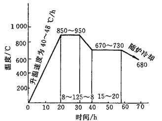 图4-8 白心可锻铸铁的氧化退火法 黑心可锻铸铁的中性退火法如图4-9所示,将铸件装入密封的箱内,一般可参照图4-9所示的规范进行退火处理.第一次保温(850~950℃)促成第一次石墨化过程,使共晶渗碳体分解为奥氏体和团絮状石墨的组织.第二次保温(670~730℃)为第二次石墨化过程,使共析转变产物中的渗碳体以及可能预先析出的二次渗碳体全部分解为铁素体和团絮状石墨的组织,获得黑心可锻铸铁.