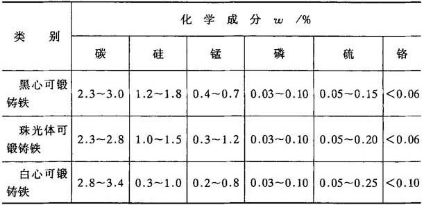 图4-9 黑心可锻铸铁的中性退火法 3.可锻铸铁的化学成分、牌号及力学性能 可锻铸铁的化学成分如表4-20所示.可锻铸铁的牌号和力学性能如表4-21和表4-22所示.牌号中的“KT”为“可锻”二字的汉语拼音字头,“KTZ”表示珠光体可锻铸铁.后面的两组数字分别代表最低抗拉强度和最低伸长率. 表4-20 可锻铸铁的化学成分