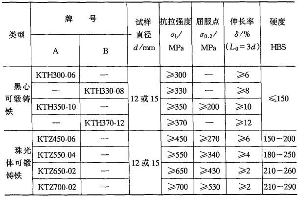 表4-21 黑心可锻铸铁和珠光体可锻铸铁的牌号及力学性能(GB9440—88)