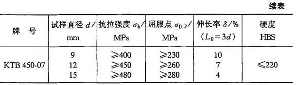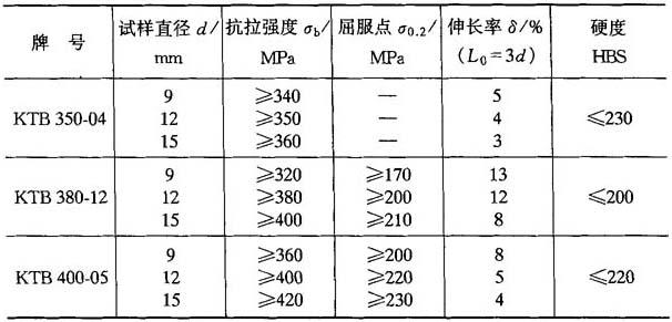 注:1.对珠光体可锻铸铁的试样两种直径尺寸,如需方没有规定,供方可任选其中一种. 2.牌号KTH300-06适用于气密性零件 3.牌号B系列为过渡牌号. 表4-22 白心可锻铸铁的牌号及力学性能(GB9440—88)