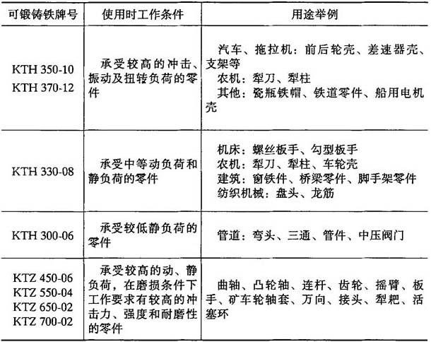 注:1.白心可锻铸铁试样直径,由需方和供方按铸件壁厚尺寸双方协议. 2.如果采用正确的工艺,所有牌号的白心可锻铸铁均可焊接 3.KTB380-12适用于强度有特殊要求和焊接后不需进行热处理的零件. 4.可锻铸铁的性能特点及应用 可锻铸铁因石墨呈团絮状,具有较高的强度,优良的塑性和韧性,适用于动负荷工作的中小型零件,可代替部分碳钢、合金钢和有色金属铸件,其性能特点及应用如表4-43所示. 表4-23 可锻铸铁性能特点及应用