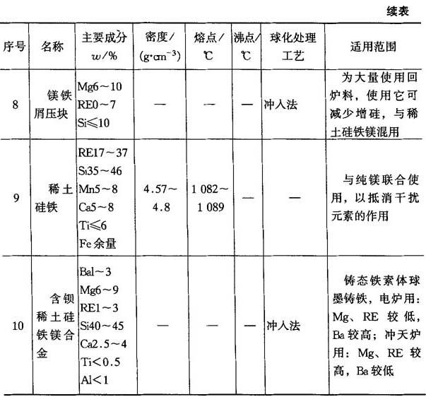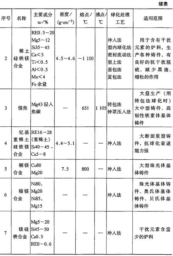2.球化剂的选用 球化处理是在原铁水中加入球化剂,使铁水在凝固过程中促使石墨成为球状的过程.常用球化剂类别及适用范围列于表4-25.其中我国使用最多的球化剂是稀土硅铁镁合金,其牌号和化学成分列于表4-26.纯镁也是使用较多的球化剂,其成分列于表4-27.用纯镁进行球化处理时常附加稀土硅铁合金或混合稀土以抵消干扰元素的不良影响.稀土硅铁合金成分列于表4-28. 表4-25 国内外常用球化剂类别及适用范围