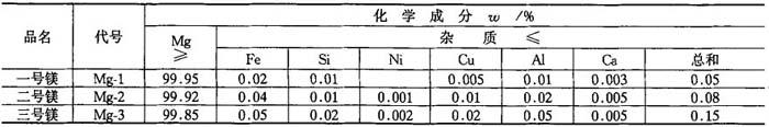 注:1.需方对化学成分有特殊要求时,由供需双方另行协商. 2.合金应呈块状变货,块度范围为3~<25mm、25~<50mm、50~100mm,合金不得有粉化. 表4-27 镁锭成分