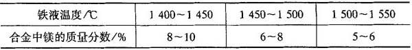 表4-32 铁液温度与稀土镁硅铁含镁量的关系
