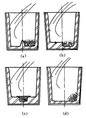 图4-10 冲入法球化处理包 (a)堤坝式;(b)凹坑式;(c)洞穴式;(d)平底式 ②球化剂装载 处理0.5~3t、1400~1430℃铁液时,球化剂粒度为15~30mm,粉状物不大于10%,温度低时不可用粉状物.先将处理包预热至大于600~800℃(暗红或红色),清除包底残渣铁块.向堤坝或凹坑内装入球化剂,平底包可放入一侧.上面覆盖硅铁,其粒度等于或小于球化剂.然后再覆盖无锈铁屑或草灰、苏打、珍珠岩集渣剂等.铁液温度过高时可盖铁(钢)板.铁液温度较高时要注意舂紧和覆盖操作. ③冲入铁液 铁液冲向未放置球化剂的一侧.冲入2/3~1/2铁液,其深度不小于200~250mm。冲入后反应沸腾约1min以上.如反应太迟,可用钢钎捅破覆盖层,沸腾将要结束时,再冲入其余铁液.处理量较少时也可一次冲满.补加铁液时可随流添加孕育剂.处理完毕,加集渣剂,如草灰、珍珠岩,搅拌后彻底扒渣,再覆盖保温剂,如草灰、珍珠岩等.处理后0.5~3t包铁液降温50~100℃,大包降温较少. ④球化情况判断 铁液冲入一定高度(>200~250mm)后开始起爆,均匀持续沸腾足够时间(>1min),表示反应正常.反应过猛喷出铁液表示烧损过大,反应时间过短、过长属不正常现象.补加铁液时液面逸出镁光及白黄火焰表示正常.处理后铁液表面易形成氧化膜表示正常.将铁液搅拌后深入液面下取样浇三角试样或圆棒检查球化情况. ⑤炉前试样检验法 (1)取样,球化孕育处理搅拌扒渣后,从表面下取铁液浇入图4-11所示试样的砂型中,待中心全部凝固后取出,表面呈暗红色.底面向下淬入水中冷却,打断观察断口.也可采用Φ15~30mm圆棒试样.