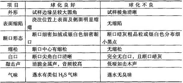 图4-11 炉前试样 推荐尺寸:b=25mm,h=50mm,l=150mm (2)判断方法如表.4-33所示.注意,试样淬水过早可能会造成误判.铸件(尤其后期浇注者)的球化等级可低于炉前试样.此法可结合球化处理过程中的现象辅助判断,为控制球化工艺质量的手段,不作为检验产品质量的依据. 表4-33 炉前三角试样球化判断法