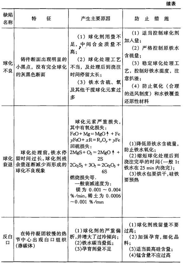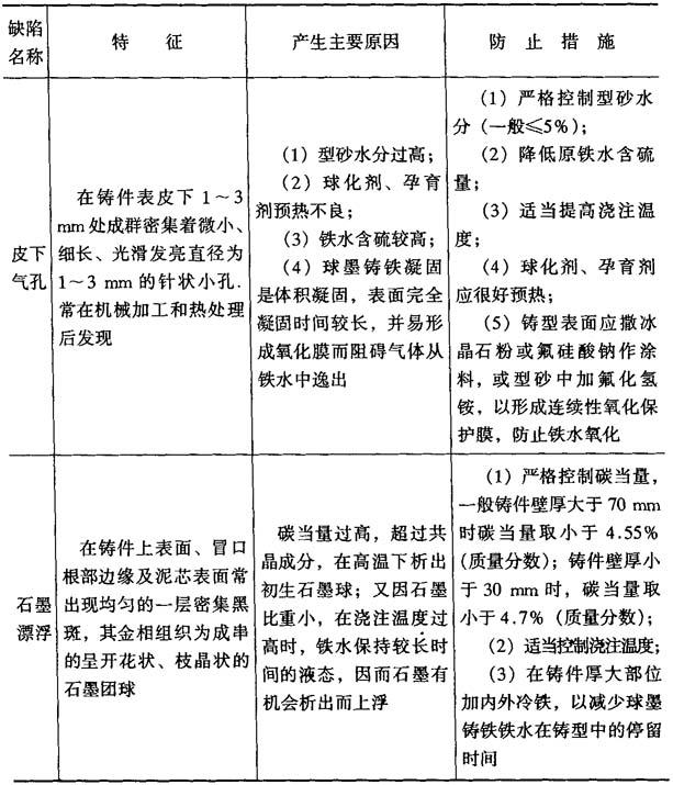 ⑥安用防护 操作者戴手套、口罩,穿工作服,防止含稀土合金粉末侵入人体.防止起爆时飞溅烫伤.观察球化反应时戴防护眼镜. 5.球墨铸铁的主要缺陷和防止方法 球墨铸铁的主要缺陷和防止方法如表3-34所示. 表4-34 球墨铸铁的缺陷和防止方法表