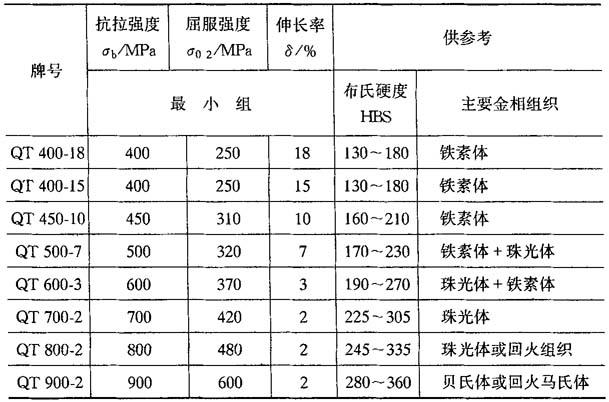 6.球墨铸铁的力学性能 球墨铸铁因石墨呈球状,其削弱基体和造成应力集中的作用大大减校因而能充分发挥基体的作用.它的强度和塑性均已超过一般灰铸铁和可锻铸铁,接近铸钢.通常球墨铸铁抗拉强度为400~600MPa,与钢大体相同,它的拉伸屈服极限为300~400MPa,拉伸屈强比(σs/σb)为0.7~0.8.球墨铸铁的牌号和力学性能如表4-35所示.牌号中的“QT”为“球铁”二字的汉语拼音字头;后面的两组数字,第一组代表抗拉强度的最低值,第二组代表伸长率的最低值.球墨铸铁与其他金属材料性能对比如表4-36所示. 表4-35 单铸试块球墨铸铁力学性能(GB1348—88)