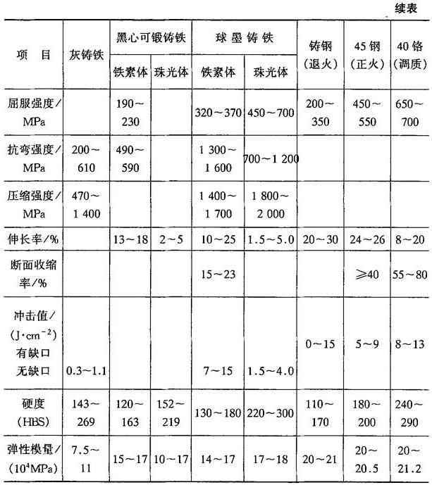 表4-36 球墨铸铁与其他金属材料性能对比表