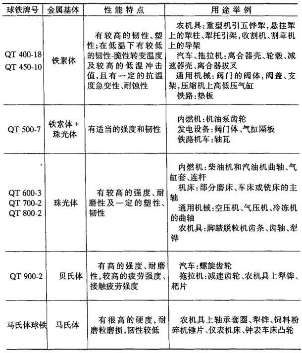 7.球墨铸铁的性能特点及应用 球墨铸铁具有良好的力学性能和加工工艺性能,因此应用范围逐渐扩大.球墨铸铁性能特点及应用如表4-37所示. 表4-37 球墨铸铁性能特点及应用