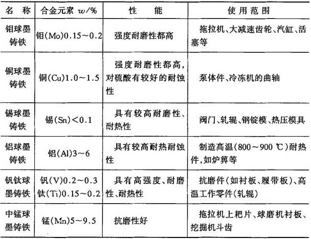 8.合金球墨铸铁 合金球墨铸铁是指在一般球墨铸铁内,另添加一定的铜、钼、镍、铬和钒等合金元素熔炼获得的球墨铸铁,如表4-38所示. 表4-38 合金球墨铸铁的种类及性能