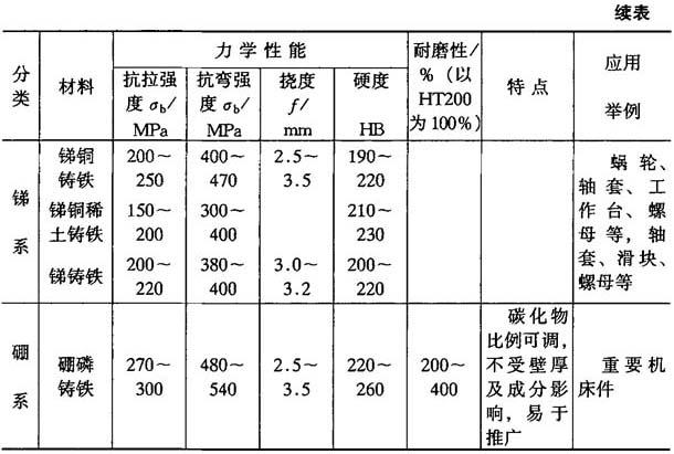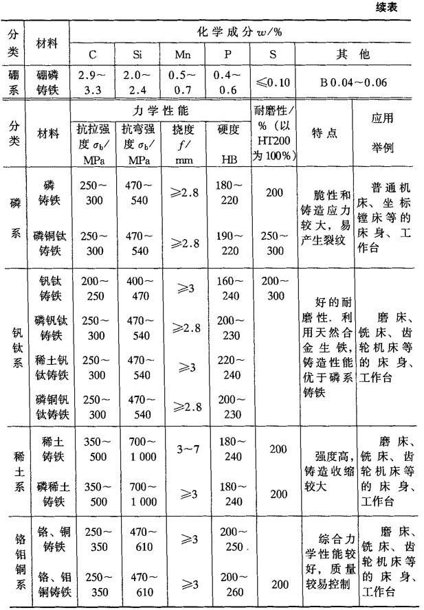 4.3.1.7 合金铸铁 在一般铸铁中添加一些合金元素,使铸铁中石墨的形态、碳化物和基体发生变化,因而改善其力学性能和理化性能,来达到各种不同的使用要求.这些铸造合金称为合金铸铁.合金铸铁按合金化的程度,一般可分为三类: 低合金铸铁:合金元素的质量分数<3%; 中合金铸铁:合金元素的质量分数=3%~10%; 高合金铸铁:合金元素的质量分数>10%. 1.耐磨铸铁 在润滑或半润滑条件下工作的部件(如机床导轨、缸套和活塞环等),不仅需要工作时磨损校还要有较小的摩擦系数和较好的导热性及良好的机加工性,这类铸铁称为耐磨铸铁.耐磨铸铁的组织为:在较软的基体上分布着适宜的硬化相,在摩擦副相互作用下,较软的基体凹下,保持着油膜,可降低磨损.硬化对耐磨性有明显的影响,其硬度较高,分布越均匀,耐磨性越好.各种用途的耐磨铸铁实例如表4-41至表4-43所示. 表4-41 机床用耐磨铸铁