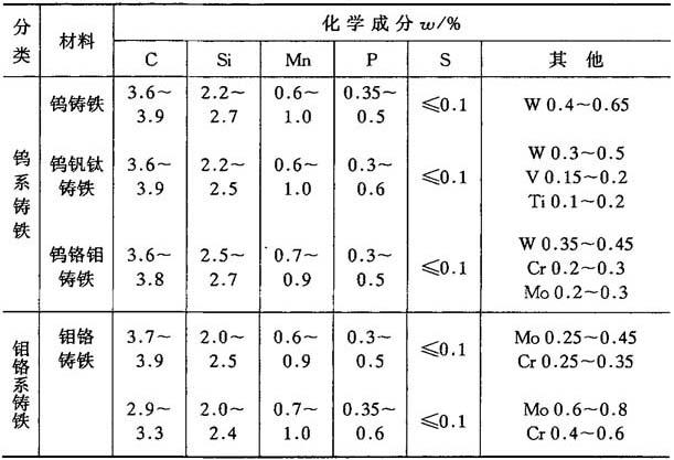 2.抗磨铸铁 具有良好抗磨料磨损性能的各类铸铁称为抗磨铸铁.抗磨铸铁在干摩擦且有外来硬颗粒或磨料条件下工作,要求铸铁的硬度高,组织均匀,通常用莱氏体、马氏体、贝氏体或奥氏体组织.生产中常采用白口铸铁为抗磨铸铁,这种铸铁中碳化物分布于金属基体中,没有石墨,硬度很高.如果进一步提高其耐磨性,可采用低合金白口铸铁或高合金白口铸铁.几种常用抗磨白口铸铁的化学成分和组织特点如表4-44所示. 表4-44 常用抗磨白口铸铁的化学成分和组织特点