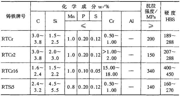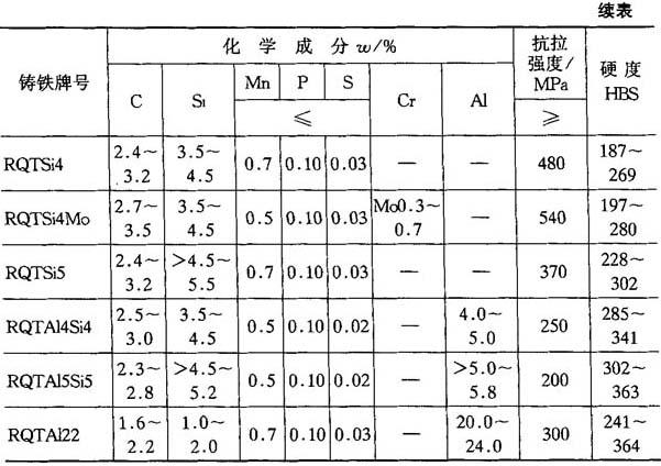表4-46 耐热铸铁牌号、成分、性能(GB9437—88)
