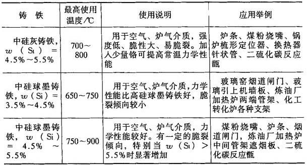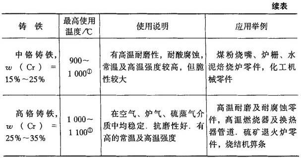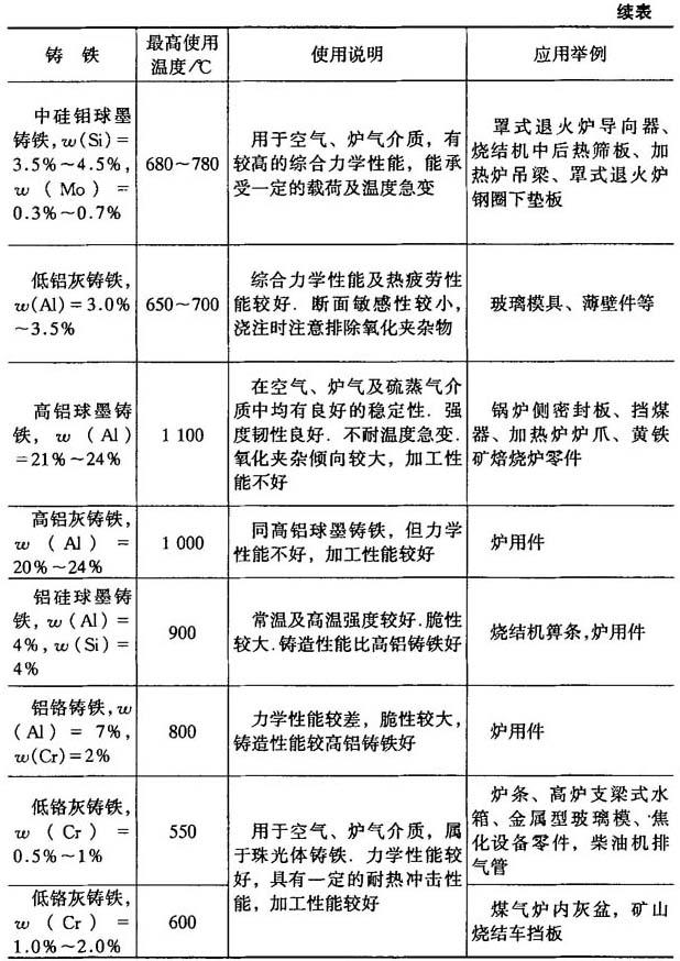 耐热铸铁的工作温度一般是按其抗氧化、抗生长指标来选择的,这个指标通常是指氧化平均速度不大于0.5g/(m2·h),生长率不大于0.2%.各种耐热铸铁的工作温度、适用条件及用途见表4-47. 表4-47 耐热铸铁的使用条件与应用