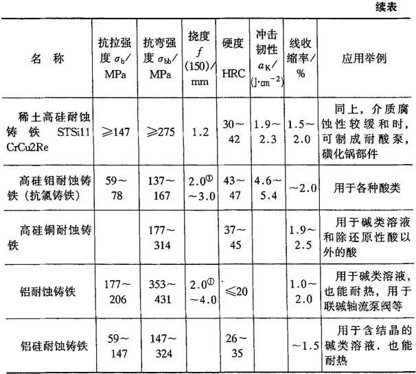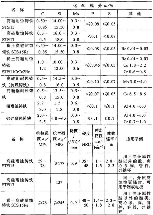 表4-49 耐蚀铸铁的化学成分、性能及应用