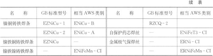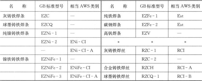 | 释义 | 铸铁焊条和焊丝的GB标准和AWS标准比较 铸铁焊条和焊丝的GB标准和AWS标准之间有一定的区别。GB标准中有铸铁焊条,而AWS标准无铸铁焊条。在镍基焊条中,AWS标准无相应的EZNiFeCu型号,而GB标准则无相应的ENiFeMn-CI类别。此外,GB标准中无AWS标准中的自保护药芯焊丝和金属极气体保护焊焊丝。表6.2-9列出了两种标准的铸铁用焊条和焊丝(填充丝)的对照情况。 表6.2-9 GB标准与AWS标准的铸铁用焊条和焊丝对照