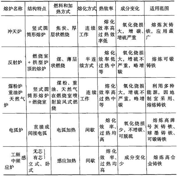 | 释义 | 铸铁的熔炼 铸铁的熔炼应使铁水的化学成分符合要求,保证铁水具有足够高的温度,并尽量降低熔炼铁水的能源消耗.这就要根据铸铁的特点来选择合适的熔炼设备和控制工艺. 4.4.1.1 铸铁熔炼设备 常用铸铁熔炼设备见表4-78. 表4-78 常用铸铁熔炼设备