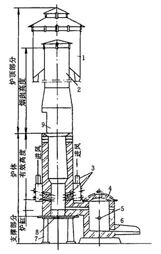 图4-12 冲天炉主要结构简图 1—除尘器;2—烟囱;3—送风系统;4—前炉;5—出渣口;6—出铁口;7—支柱;8—炉底板;9—加料口 4.4.1.3 冲天炉的主要设计参数 冲天炉“三化”设计系列参数如表4-79所示,二排大间距冲天炉的主要参数如表4-80所示. 表4-79 冲天炉“三化”设计系列参数