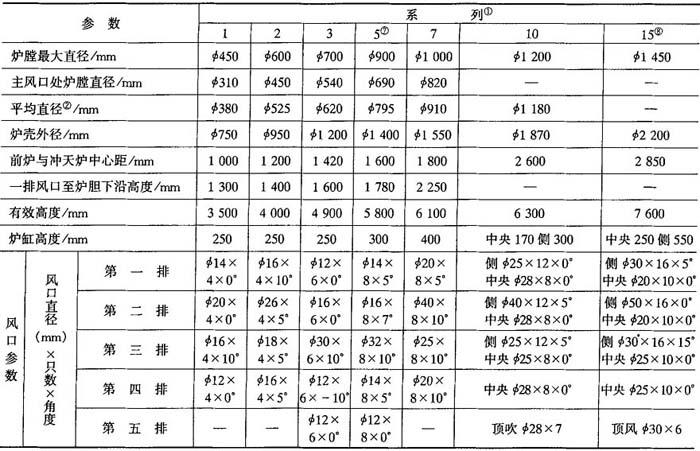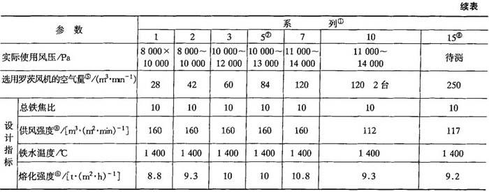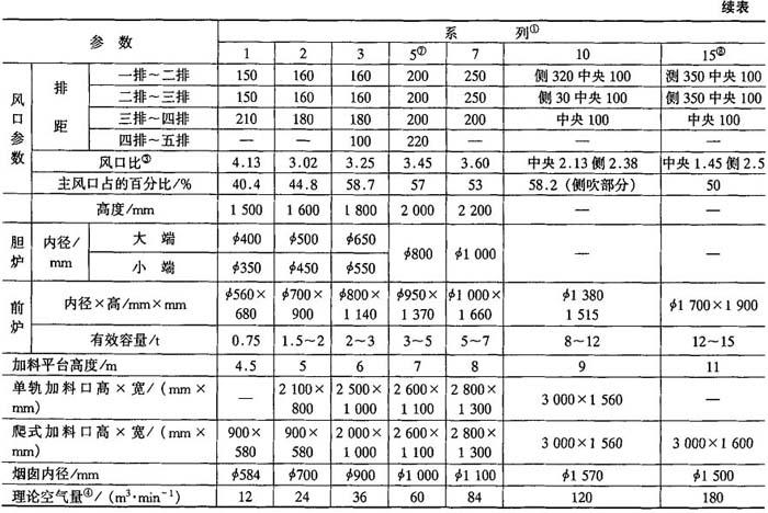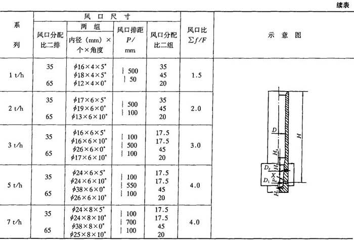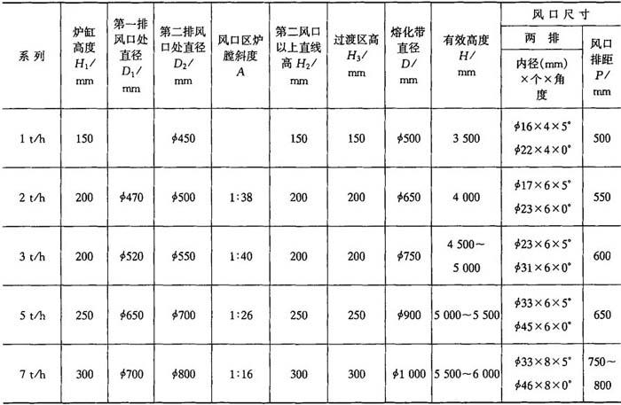 ①1、2、3、5、7t冲天炉采用多排小风口曲线炉膛,10、15t冲天炉采用中央与侧吹相结合的送风方式系列标号即为炉子的标称熔化率(t/h). ②平均直径=(炉膛最大直径+主风处炉膛直径)/2 ③风口比和供风强度均按主风口处炉膛直径计. ④理论空气量按7.2m3/kg焦炭计(固定碳按80%、燃烧比ηv=1计). ⑤鼓风机按理论空气量的约150%选用. ⑥熔化强度按平均直径计. ⑦5t冲天炉设计有活动炉缸与固定炉缸两种. ⑧15t冲天炉参数仅供参考,待成熟后再纳入系列 注:本表于1975年1月22日一机部冲天炉“三化”设计方案审查会上通过. 表4-80 二排大间距冲天炉主要参数
