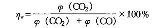 可见,炉气中CO的比例越大,其化学热损失也越大;但是,为了减少硅、锰等元素的氧化烧损,保证铁液冶金质量,炉气中要有一定数量的CO.炉气中CO量的多少,不仅说明焦炭燃烧的完全程度如何,同时也表明了炉气氧气性的高低,对熔炼过程的热效率和冶金作用有着重要的影响.炉气中CO2和CO的比例关系通常用燃烧系数(ηv)表示为: