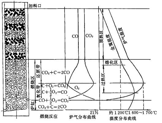 式中 CO2、CO——分别为炉气中CO2和CO的体积百分数. 从充分利用焦炭能量的角度来看,燃烧系数愈大愈好,但从保证铁液质量、减少金属元素氧化烧损的角度来看,燃烧系数不能太高.所以炉气成分应当根据产品对铁液质量的不同要求,进行合理选择和控制. 冲天炉内的燃烧过程是在底焦中进行的,根据焦炭燃烧的化学反应,可将底焦燃烧划分为两个反应区段: 氧化带:从主排风口到自由氧基本耗荆CO2浓度达到最大值的区域,发生下列反应: