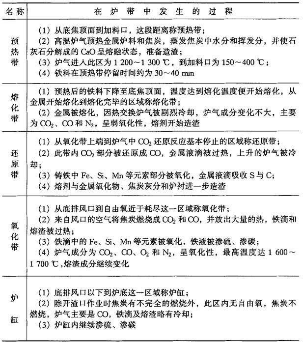图4-13 冲天炉工作过程原理图 2.热量交换 冲天炉的热量交换是在高温炉气向上运动,固体炉料和铁液向下运动的过程中进行的.由于炉壁效应的影响,炉气在炉子纵截面和横截面上的分布都是不均匀的,致使温度分布也不均匀,氧化带上部CO2含量最多处,温度最高,再向上,由于CO2被还原及与炉料热交换,温度逐渐下降. 根据炉气温度和炉料、铁液的受热状态,一般将冲天炉高度方向划分为预热区、熔化区、过热区和炉缸区等几个区域,如图4-13所示.各区温度和炉料状态不同,热交换方式和效果也不相同.冲天炉内各区域情况 如表4-82所示. 表4-82 冲天炉内五大区域