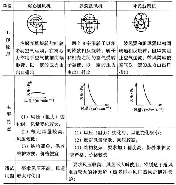 冲天炉用鼓风机要求供风压力足够并且风量稳定,以保证冲天炉稳定地工作.此外,冲天炉还要求风机结构简单,维修方便,能源消耗少,噪声低.几种常见风机的比较见表4-84. 表4-84 几种风机的比较