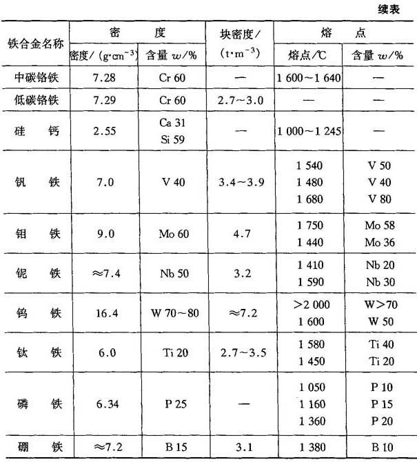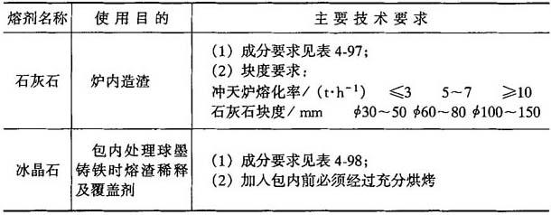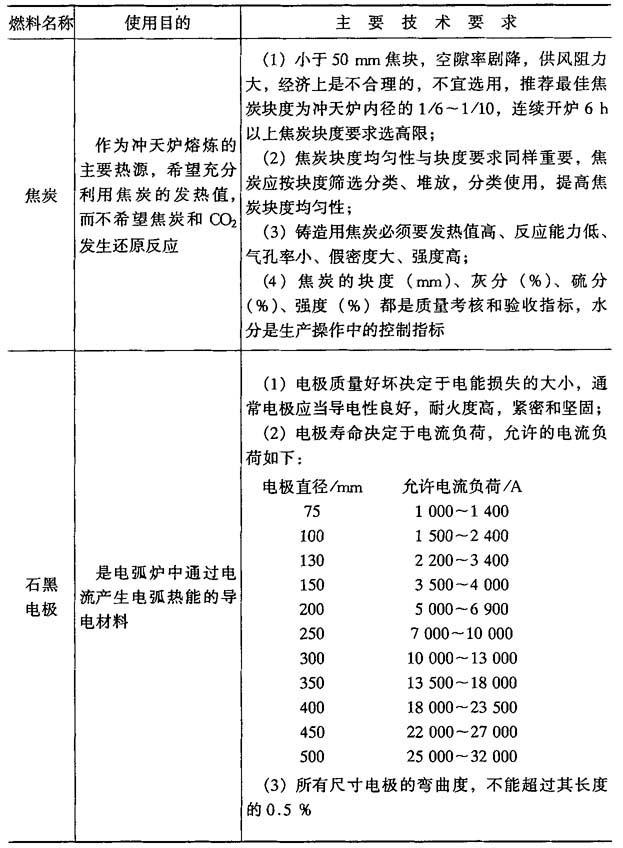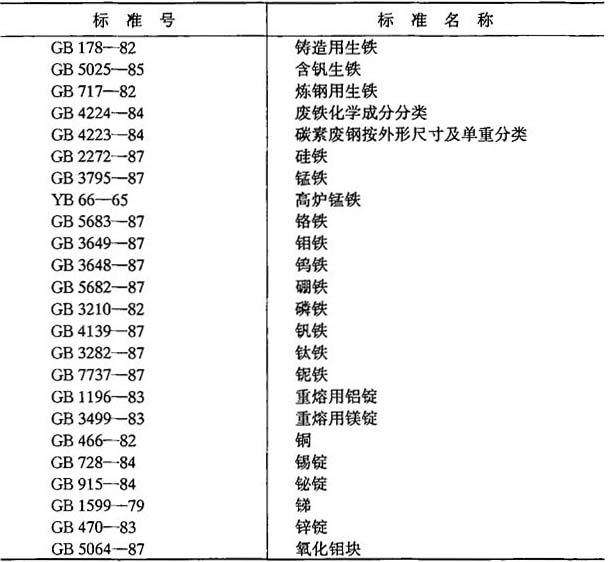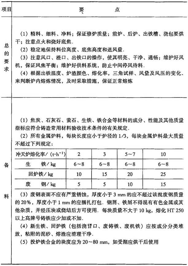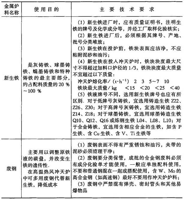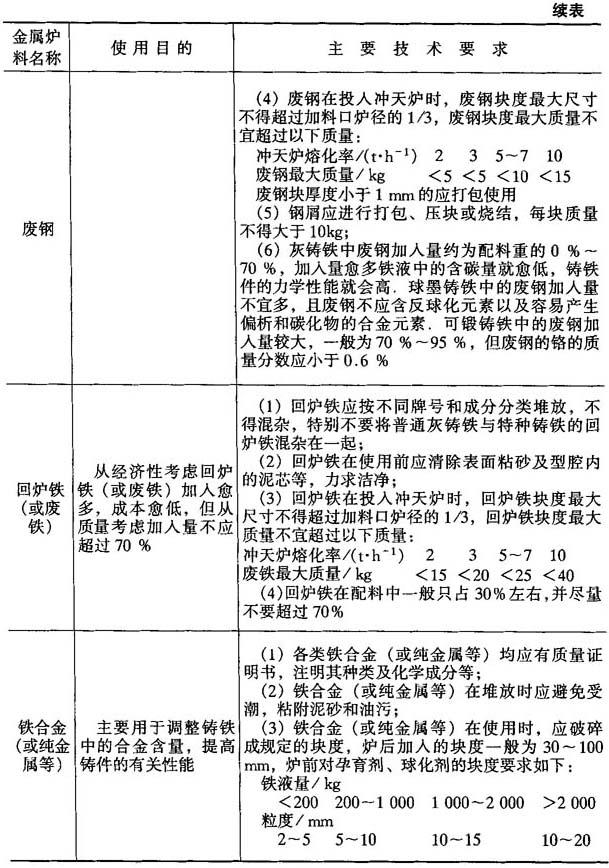 鼓风机选择是否合理,对冲天炉熔炼影响较大.一般根据冲天炉所需风量和风压,同时考虑到风带和风管等处的漏风损失和管路压力损失来选择鼓风机. 在确定离心鼓风机和罗茨鼓风机(包括叶氏鼓风机)型号时,侧重点不同,离心鼓风机的风量大、风压校应首先满足冲天炉系统的阻力要求,由风压来决定鼓风机的型号.罗茨鼓风机的风压大,风量校选择鼓风机型号时主要考虑风量. 4.4.1.6 炉料及修炉材料 1.炉料 (1)金属炉料.对金属炉料的主要技术要求如表4-89所示,有关金属炉料规格的标准如表4-90所示.铁合金的密度、块密度及熔点如表4-91所示. 表4-89 对金属炉料的主要技术要求