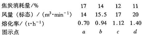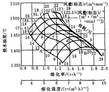 4.4.1.7 冲天炉熔炼的控制 1.冲天炉操作参数的选择 冲天炉熔炼过程的焦炭消耗量(简称焦耗)、风量、炉子的熔化率和铁水温度四者之间存在着一定的关系,这种关系可以通过网状图表示出来,如图4-14所示. 从网状图可以看到下列关系: (1)冲天炉焦炭消耗量一定时,随着风量的增加,冲天炉的熔化率总是增加的,而铁水温度则先是提高,至某一最大值后开始下降.所以,对于每一种焦炭消耗量,有一个对应于最高铁水温度的合适的风量(或送风强度),称为最佳风量.焦炭消耗量愈大,最佳风量也愈大,铁水最高温度也愈高,而炉子熔化率则下降.图中各黑点的连线即是最佳风量的连接线.试验表明,当冲天炉用最佳风量操作时,熔炼总烧损也将达到最低值. (2)风量一定时,随着焦炭消耗量的增大,铁水温度提高,炉子熔化率下降. (3)为达到一定的铁水温度,可以用不同焦炭消耗量与风量的配合.例如,为达到1450℃的铁水温度,可以用下列焦炭消耗量与风量的配合,并得到不同的熔化率: