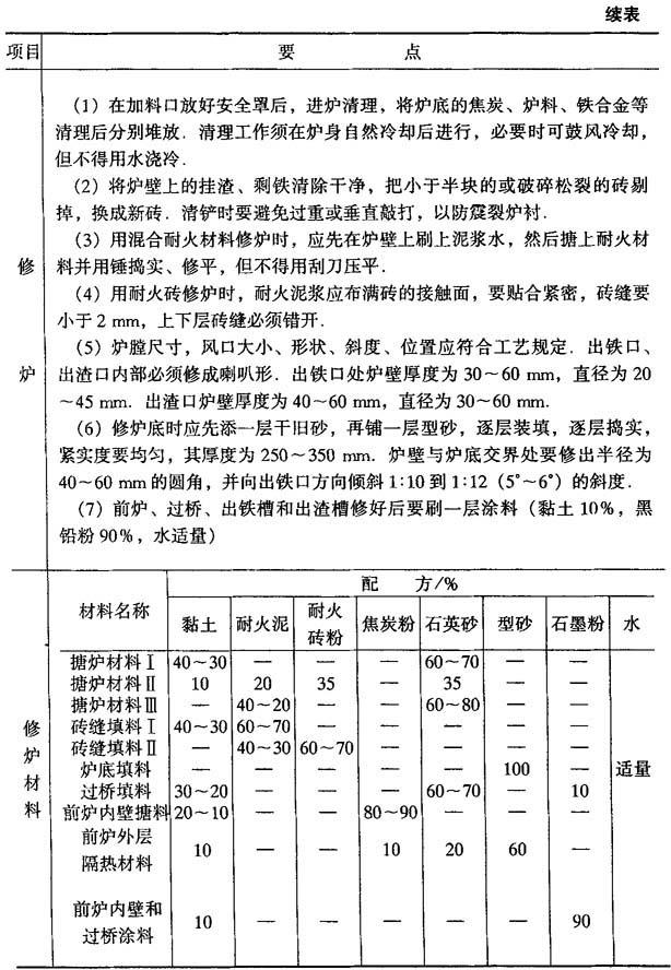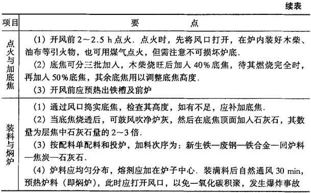 图4-14 冲天炉网状图 由此可见,以d点的情况为最好,焦炭消耗量低而熔化率高.当然,从图上还可以找出很多不同的焦耗与风量的配合.但对于一定的炉子来说,为使铁水温度合乎要求所可能采用的各种风量与焦炭消耗量配合当中,有一种最佳的配合,当冲天炉用这种配合操作时,就能既节约焦炭,又多出铁水.这种风量与焦炭消耗量的最佳配合点,就是图上最佳风量的连结线(虚线)与所需铁水温度和等焦炭消耗曲线的交点.由此可见,寻求最佳的风量与焦炭消耗量配合对于改善炉子工作具有十分重要的意义. 必须指出,这张网状图是用内径为Φ500mm的直筒形冲天炉试验测定的,图上的数据只适用于与此类同的情况.但图中所反映的变化规律则是有普遍意义的. 2.冲天炉熔炼操作要点 冲天炉熔炼基本操作如表4-102所示,冲天炉熔炼操作常见故障及排除方法如表4-103所示. 表4-102 冲天炉熔炼基本操作