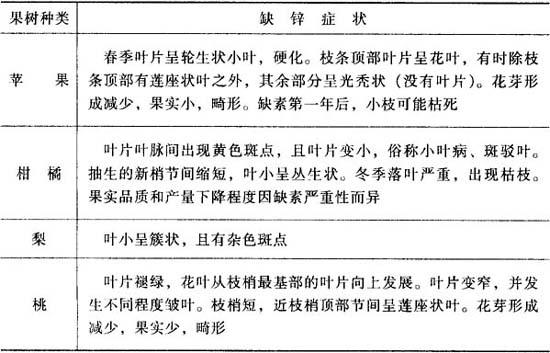 | 释义 | 锌素失调与防治 1.缺锌症状 果树缺锌时,其典型症状是小叶、簇叶病,枝梢顶端生长受阻,枝条长度减小,节间缩短,叶片叶脉间褪绿。几种主要果树缺锌症状见表3-42。 表3-42 几种主要果树的缺锌症状
