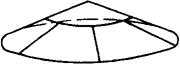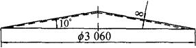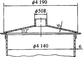 图3-146 立体图 锥形顶盖的封头形式,其底角一般在10°~15°,下面列举几种形式的排版下料方法,以供参考。 1.一带多片倒颠互插排版下料方法 如图3-147所示,为腈装置进料罐顶盖施工图,从图中可看出,底角较小,因而展开料包角一定会很大,大小端差也会很大,所以这种顶盖的排版,以多片倒颠互插为最节约原材料。