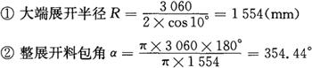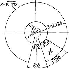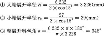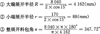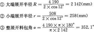 ④总弧长S=π×8040=25258(mm) ⑤大端缺口弧长S1=2π×4162-π×8040=892(mm) ⑥小端缺口弧长S2=2π×88-π×170=19(mm)