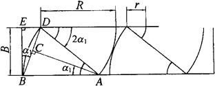 图3-148 瓜瓣顶盖倒颠互插计算原理 在直角三角形ACB和BED中: BD=2·R·sinα1 板宽BE=BD·cosα1(令BE=B) ①下面试计算三个数据,以确定一扇展开料包角。 按α1=16.5°计算:BD=2×2142×sin16.5°=1217(mm)B=1217×cos16.5°=1167(mm) 同理得: 按α1=17°计算:B=1198mm 按α1=17.5°计算:B=1229mm 从以上的计算结果看,16.5°、17°、17.5°离板边的距离分别为-53mm、-23mm、+9mm,考虑到还要加刨边余量的因素,所以按16.5°为合理。 ②粗确定瓜瓣等份数的计算:352.1°÷2×16.5°=10.67(等份) 由此看出,根据板宽1220mm,应分11等份。 (3)排版图各数据的计算(排版图见图3-149)