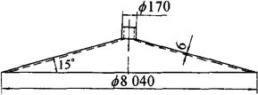 图3-150 在板上划线方法 (5)成形方法 ①若上卷板机卷制,可预组焊成两大片,分片在卷板机上卷制;焊成整体是无法卷制的。此法适于弹性较小的较厚板。 ②不上卷板机卷制时,可预组焊成一整体,以锥顶为吊点吊起,使对口合拢。此法适于弹性好的较薄板和底角较小者(底角越小缺口越小)。 2.两带板排版下料方法 如图3-151和图3-152所示,为糠醛贮罐顶盖施工图和展开图,从图中可看出,大端直径较大,小端直径较小,缺口大端弧长较大等于692mm,若下成多片一带板形式,小端每等份弧长过小,造成应力集中,这是设计所不允许的,所以分成两带为宜,即下带分若干片,仍采用倒颠互插法划线,上带为整料或两半,用手工槽制成形。