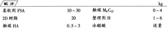 制法 先将2D树脂和柔软剂FSA混合均匀。然后加入其他组分,搅拌均匀,用冰醋酸调节pH值为5,即为柔软剂。使用时将织物经柔软剂混合液二浸二轧,然后预烘,焙烘(180℃,30min)整理即可。它主要用于锦纶和涤纶织物,也适于天然纤维柔软处理。 |