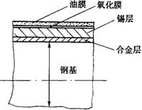 事实上,由于近20年来,钢基板已逐渐全部使用连铸钢,钢基内的各种杂质愈来愈少,各相关残留元素可更准确控制,钢基的耐蚀力和耐加工性均有所提高。 (2)镀锡薄板组成 镀锡薄板的典型剖面如图3-3-1所示,即钢基的两面向外,均依次为合金层、锡层、氧化膜、油膜,各层厚度如下:
