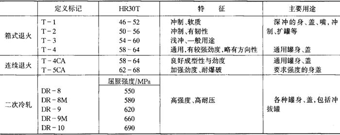 注:1lb=0.45kg。 (4)原板尺寸 自20世纪90年代以来,各国镀锡板生产用原板宽度(称轧制宽度)多为800mm以上,剪切长度也多在800~1100mm,板宽及剪切尺寸总是根据罐型裁片最少浪费为准则,目前裁板损失均可控制在:罐身片2%左右,圆片13%左右。 商品的原板或镀锡板,当前,按国际标准均以0.005mm为厚度级差。在20000张以上的交易中,镀锡板的厚度容许公差各国标准均规定为±2.5%以下。 (5)调质度(Temper) 镀锡薄板的机械性能,过去各国常以硬度、抗拉强度、屈服强度及埃里克森试验值等来表示,现在已统一用表面洛氏硬度表示一次冷轧薄板的调质度。二次冷轧板一概用屈服强度来表示调质度。 调质度表示通过机械处理或热处理所赋予金属性质状态的程度,是薄板综合机械性能指标。 由于材料退火和压延的状态不同,因此,箱式退火(将4~6个10t左右的钢卷,在密封体内N2氛围下,加热至600℃以上几十个小时,再缓慢冷却)和连续退火(带钢在几分钟内穿过氮气保护的高温区,再急冷)或再于退火后进行二次冷轧,所获得的材料调质度各异。 表面洛氏硬度HR30T是以300N的压力,将一个直径为1.588mm(1/16in)的小钢球压入薄板的深度来计量的,例如当压入深度为43μm时,我们定义其洛氏硬度值为: HR30T=100(定值)-43(实际压入深度)=57 很明显,压入愈深,则材料愈软,调质度数值愈小;压入愈浅则材料愈硬,调质度数值愈高。 根据薄板实际硬度的大小,可将它们分为若干个梯级,级差3(或4)。在这样的规定之下,上述不同退火及加工方式能使薄板获得的调质度范围如表3-3-3所示。 表3-3-3 镀锡板调质度分类