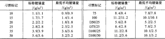 注:ISO一直建议的标记法是直接记录硬度值,如T-4记为T61,DR-9记为DR620等。 2.镀锡量 镀锡薄板上的锡层厚度0.10~1.5μm,是电镀复上的。由于微观不够平、且又极薄,所以不用μm,而采用每平方米的锡质量(g/m2)来间接计量镀锡厚度。过去商业上习惯以1基箱(BB)镀锡板两面镀锡质量(1b)的100倍的数字表示。例如单面镀锡量为11.2g/m2的镀锡板相当于11b/基箱,即 除了用 当前各国生产的镀锡薄板均按表3-3-4的规定供货。 表3-3-4 镀锡薄板镀锡量