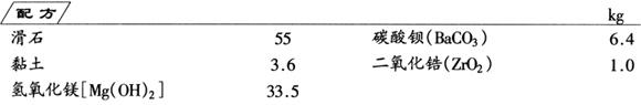 先将滑石预烧至1350~1400℃以排出结晶水,破坏原有鳞片结构,再将其破碎研磨,过万孔筛。再加入其余全部组分,共同研磨成细粉,压制成型,在1250~1300℃下烧1h,即得镁质滑石瓷