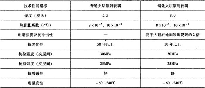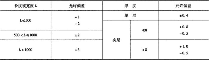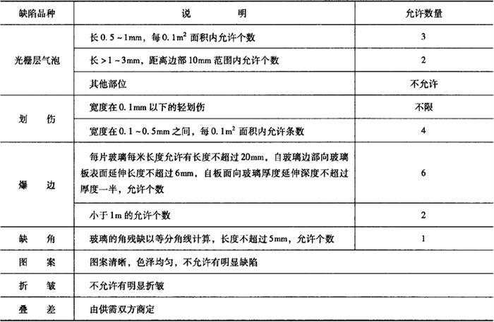 (三)镭射玻璃的主要用途 自20世纪90年代后,我国开始大量应用镭射玻璃,先后在首都机场候机楼、北京五洲大酒店、上海百乐口酒店、浙江省人民银行大堂、深圳阳光大酒店、广州娱乐大世界等大型建筑中安装使用,并取得了良好的装饰效果。 工程实践证明,镭射玻璃主要适用于高级宾馆、饭店、银行、地铁、会堂、车站、商场、候机楼、博物馆、展览馆等的室内外墙面、柱面、地面等处的装饰;也适用于桌面、吧台、招牌、隔断、雕塑贴面、电梯间、艺术屏风、高级喷水泉、大中型灯饰、商业门面及电子产品装饰等。 (四)镭射玻璃的技术要求 镭射玻璃的技术要求主要包括:玻璃长度和宽度的允许偏差、玻璃厚度的允许偏差、外观质量方面(如划伤、缺角、图案、折皱、爆边等)的要求。镭射玻璃的具体技术要求,如表17-43、表17-44所示。 表17-43 镭射玻璃尺寸允许偏差 (mm)