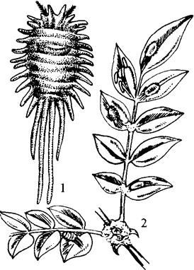 图6-43 长尾粉蚧 1.雌成虫 2.为害状 【生活习性】 1年发生2~3代。以卵囊越冬。次年5月中、下旬若虫大量孵化,群集幼芽、茎叶上吸汁为害,使枝叶萎缩、畸形。雄若虫后期成白色茧,在茧内化蛹。雌成虫产卵前先形成絮状蜡质卵囊,卵产于囊中。每雌虫可产卵200~300粒。 【防治方法】 人工刮除介壳虫。若虫盛孵期喷洒螟松1000倍液,或氧化乐果1000倍,或40%速扑杀乳油1500倍液。 该花除上述病虫外,还有炭疽病、根腐病、桃蚜、朱砂叶螨,可参阅其他花卉。 |